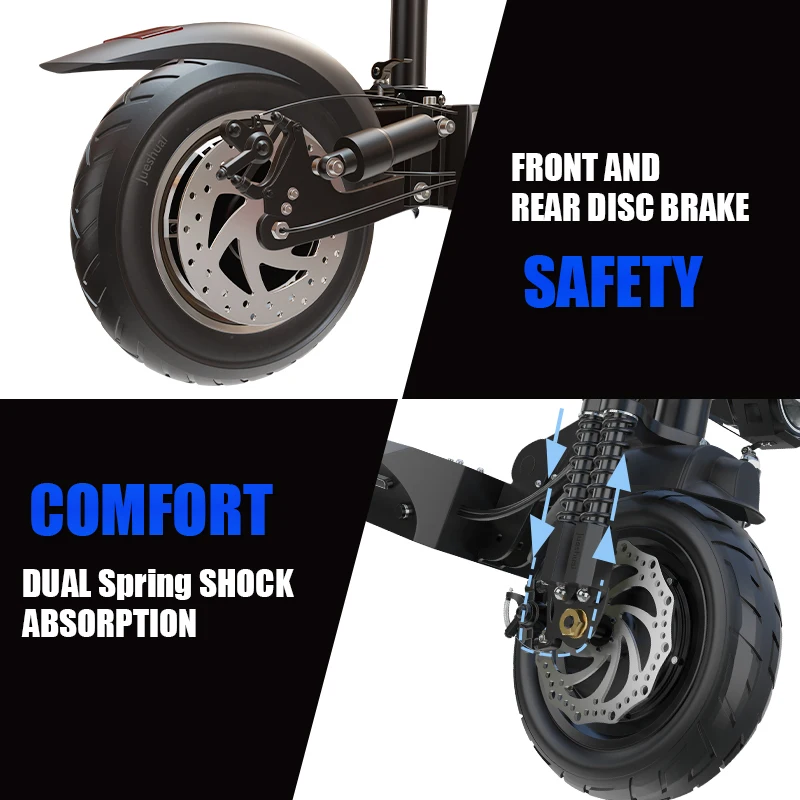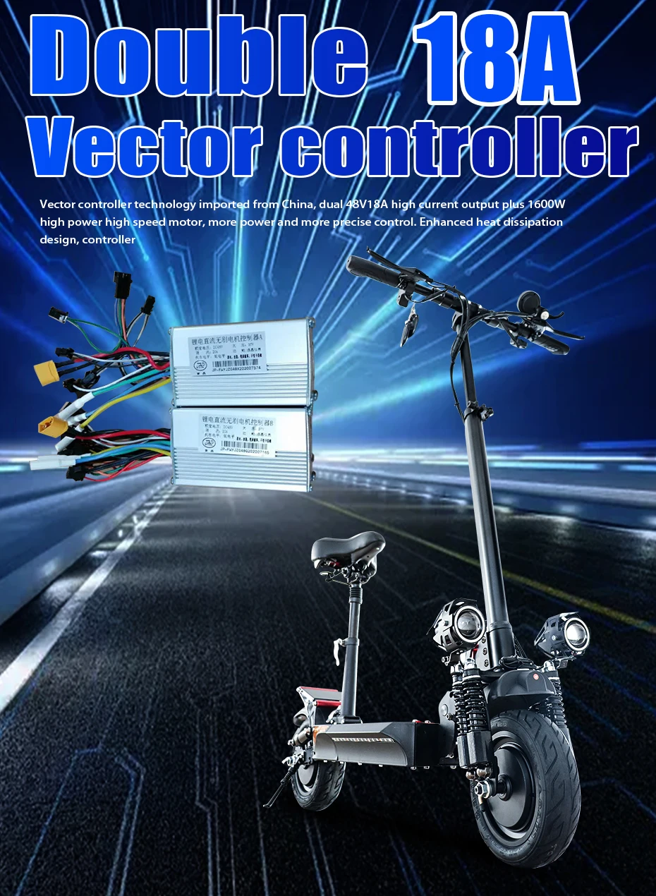 A: X500 has a 48V Dual drive, with HM 2400W motor, JP 20AH controller, 18AH battery, front and rear spring shock absorption, disc brake.