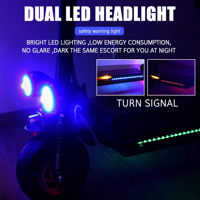 The electric scooter adopt dual led headlight can ajust the angle,cool and joyful ambient light,the colorful chassis lights are more vibrant and eye-catching when riding.