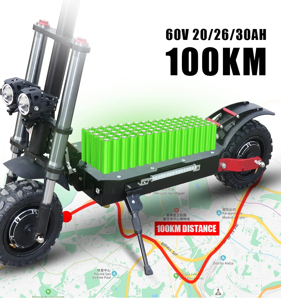 The scooter can be equipped with 3 different capacity batteries, namely 60V 20AH, 60V 26AH, 60V 30AH.