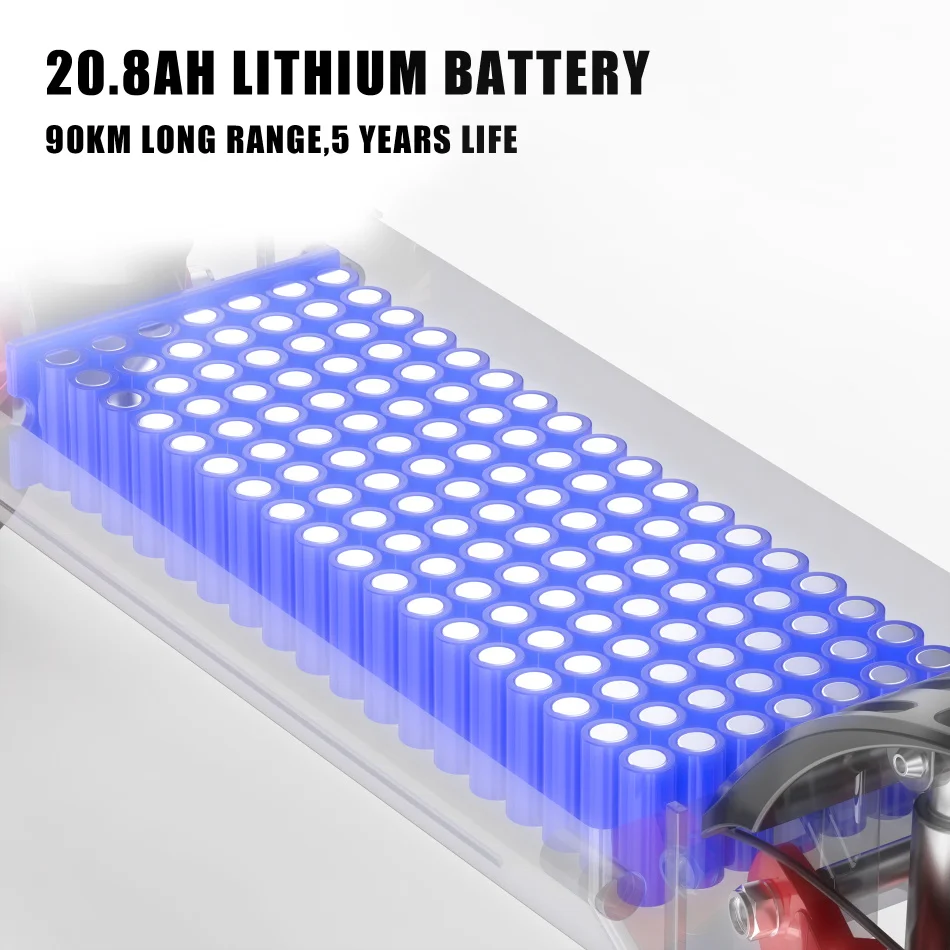 X10 Pro: 60V 3200W, 20.8AH lithium battery (18650 cells).